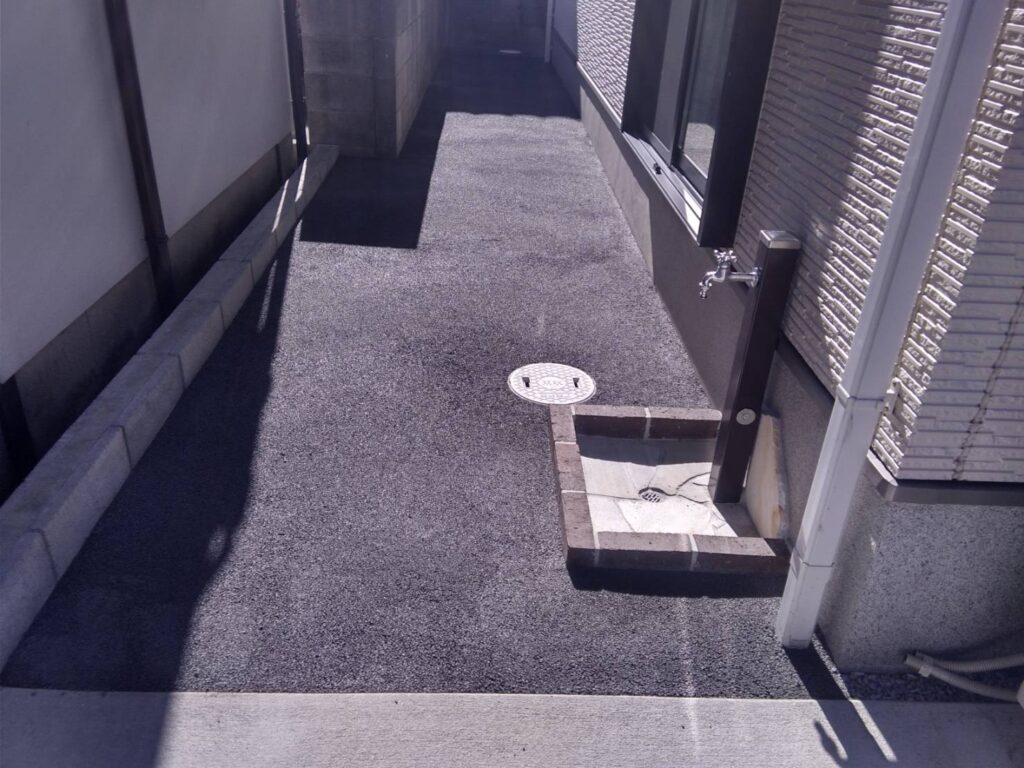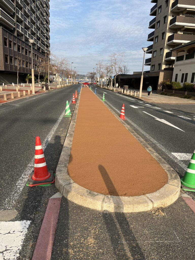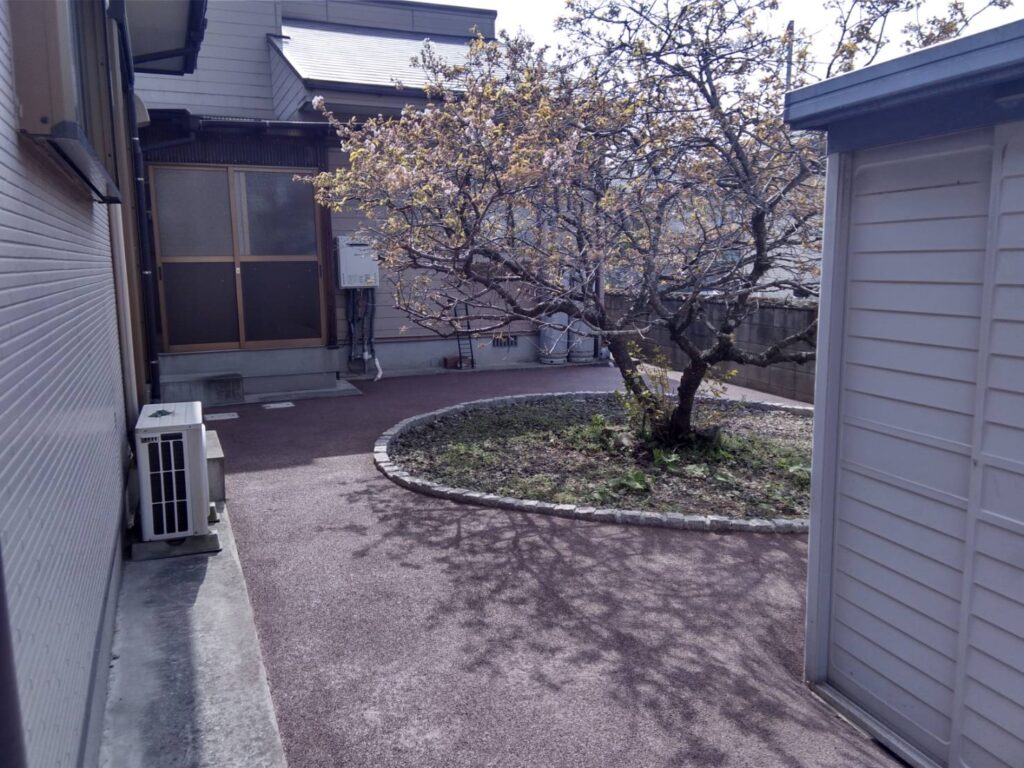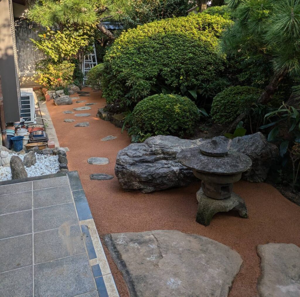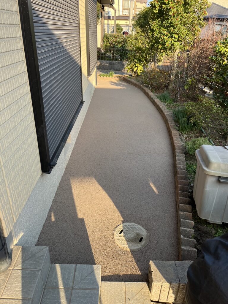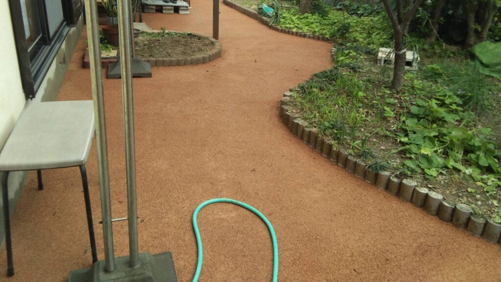「ガチン固」は、見た目は自然なまま、しっかりと固まって雑草の発生を防ぐ自然土舗装材です。 透水性が高く、水たまりにならず、雨が降ってもぬかるみにくい快適な地面を実現します。 ヒートアイランド対策にも有効で、環境にもやさしい素材です。