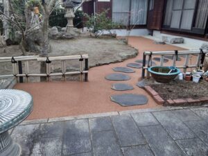 2025年11月11日 / 最終更新日時 : 2025年11月11日 オーエヌグループ ガチン固ガチン固(民間工事) 日本庭園がガチン固2色でカラフルに変身 ☆R6,10月直方市 施工前の問題点 ・草が茂ると蚊・ダニ・ハチ・ムカデなどの害虫が発生しやすくなる。・草が長い場所は、ネズミ・ヘビ・野良猫などが隠れる場所になる。 これが原因で糞害や悪臭が発生することもある。・乾いた草が多いと、タバコの火や落雷などで火事になる危険性がある。・「虫が飛んでくる」などといった理由で、ご近所からクレームが来るケースもある。 解決策 弊社では、ガチン固(ライトブラウン・ダークブラウン)を使用して施工を行い、以下のような改善を実現しました。 雑草対策:お庭全体をガチン固施工することで、除草作業をなくす。 ガチン固は土を上から舗装し雑草を抑え込むので、除草にかけるメンテナンス時間が大幅に減ります。 また、ガチン固は透水性があるため、地面がぬらるむ心配や水たまりが出来ることもなく、安心してお庭作業を楽しむことが出来ます。 更に、ガチン固を2色使うことでメリハリが出来、オシャレかつ清潔感が生まれます。 虫や動物に悩まされることもほとんどないでしょう。 美観の向上: 日本庭園をそのまま活かし、土を全てガチン固にすることで庭石が更に引き立って見えるようになりました。 いつも綺麗に整えられたお庭を365日安心して楽しんでいただけるお庭になったと思います。 この施工により、以前は煩わしかった除草作業が不要となり、事故防止と美観が飛躍的に向上しました。お客様からも大変ご満足いただいております! お庭や外構の改善に関するご相談は、お気軽にどうぞ! どんなお庭でも、ガチン固を使用することで手軽に美観と機能性を向上させることができます。 お悩みの方は、ぜひ一度ご相談ください。